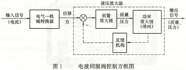 電液伺服閥由電氣一機(jī)械轉(zhuǎn)換器和液壓系統(tǒng)放大器構(gòu)成,如圖1所示。電氣一機(jī)械轉(zhuǎn)換器是將電信號(hào)轉(zhuǎn)換成機(jī)械位移;液壓放大器是將電氣一機(jī)械轉(zhuǎn)換器輸出的機(jī)械位移放大后推動(dòng)閥芯運(yùn)動(dòng),液壓放大器由前置放大級(jí)和功率放大級(jí)組成,前置放大級(jí)采用滑閥、噴嘴擋板閥或射流管閥,功率級(jí)采用滑閥形式。