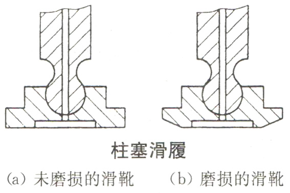 為了延長液壓油泵的使用壽命,必須定期在油路的紊流處取出油樣檢驗。保持油液的清潔度是系統(tǒng)維護保養(yǎng)的重要內(nèi)容,有時系統(tǒng)不能正常運行,就是因為控制閥閥芯被油污卡死,或產(chǎn)生阻尼、運動不暢。出現(xiàn)故障時又找不著其他原因,則清洗相關(guān)的控制閥(特別是比例閥)是重要的措施。軸向柱塞泵的損壞是從柱塞滑靴的磨損開始的,如下圖所示。當滑靴磨損到不能形成與斜盤間的靜壓油膜時,則滑靴與斜盤間的摩擦力增大,斜盤被拉傷,摩擦力進一步增大,回程盤破裂,泵的內(nèi)部損毀,所以定期將磨損(還未完全損壞)的滑靴換掉就可以避免整泵的損壞。