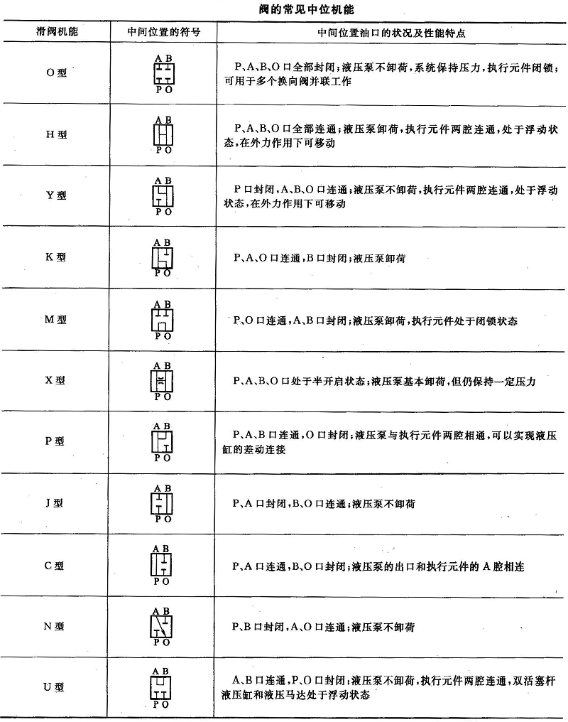 從事液壓行業(yè)的人都應(yīng)該知道多位換向閥處于不同位置時(shí),其各油口的連通情況是不同的,控制機(jī)能也不一樣。因此,把滑閥閥口的連通形式稱(chēng)為滑閥機(jī)能。對(duì)于三位閥來(lái)說(shuō),則把閥芯處于常態(tài)位(即中位)各油口的連通形式稱(chēng)為滑閥的中位機(jī)能(類(lèi)似,三位閥的左、右位分別稱(chēng)為左、右位機(jī)能)。下表列出了閥的常見(jiàn)中位機(jī)能。三位五通閥的情況與之相似。不同的中位機(jī)能是通過(guò)改變閥芯的形狀和尺寸實(shí)現(xiàn)的,它可以實(shí)現(xiàn)不同的控制和滿(mǎn)足不同的使用要求。
